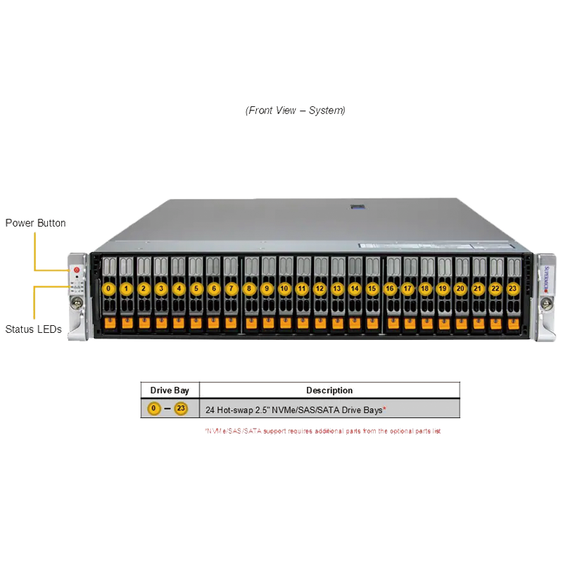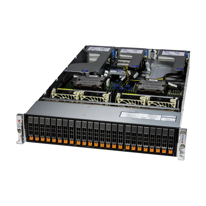 2U全闪服务器 高性能:双核AMD EPYC TM9400/9500系列处理器 海容量:支持最多24个DDR5内存插槽(1DPC),速度高达6400MT/s 强扩展:可选PCle插槽配置,最多支持8个PCle5.0x8或4个PCle5.0x16插 槽,或混合搭配